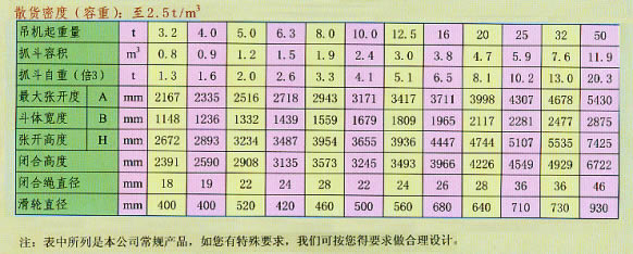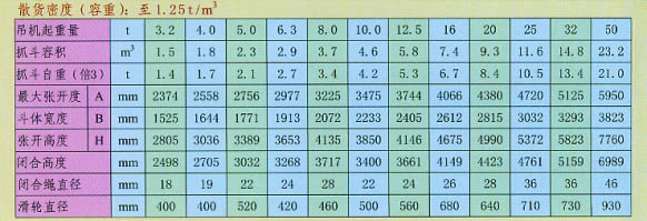 雙索雙瓣抓斗抓取比重為0.4-3.2t/m3各種粒度均勻的散貨,通常為糧食、煤炭、水泥、黃砂石子、礦粉、礦石、鹽等。抓斗容積有0.5至10立方。
